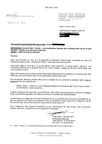 Parallèlement, suite à la parution de la « Version deux : Les thuriféraires libanais de Ben Ali sur le grill de la dictateur tunisienne », les sites renenaba.com, palestine-solidarite.org et oumma.com ont fait aussi l’objet d’un courrier analogue de la part du conseil d’Antoine Basbous pour la première version de ce texte.