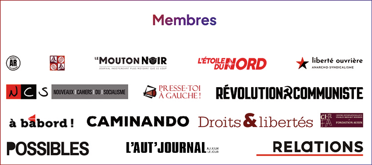 Le Regroupement rassemble des publications écrites, imprimées ou numériques, qui partagent une même sensibilité politique progressiste. Plus particulièrement, il s'intéresse aux enjeux et défis que nos médias rencontrent, ainsi qu'aux stratégies logistiques et politiques à mettre en œuvre au bénéfice du Regroupement et de ses idées. Nous comptons actuellement 15 médias membres participants, auxquels s'ajoutent deux membres observateurs et plusieurs médias alliés faisant partie d'un large réseau de collaborateur·rices. Pour le RMCG, le travail médiatique aspire à une transformation sociale animée par une volonté de mettre fin aux différents systèmes d'exploitation et formes d'oppression, et d'œuvrer pour l'établissement d'une société plus solidaire et égalitaire. Nous concevons que ces valeurs justifient le choix des sujets abordés, la manière dont on les traite et les personnes sollicitées pour les développer. Globalement, les médias du Regroupement s'appuient sur le travail collaboratif de militant·es, professionnel·les des sciences sociales et humaines [2] ainsi que de personnes et communautés directement concernées par les sujets traités, pour la plupart sur une base bénévole.