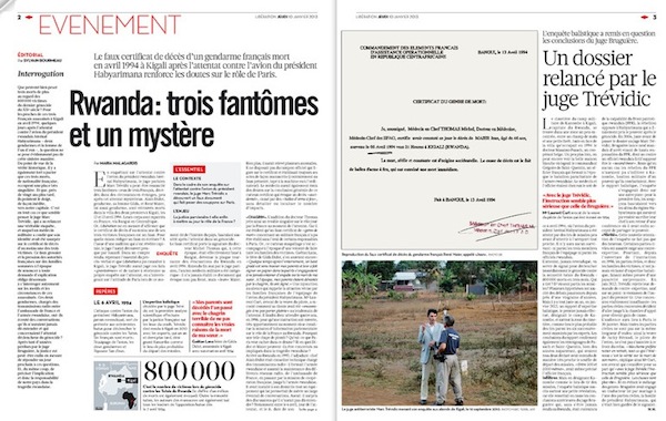 « Gendarmes tués au Rwanda, un secret français » titre la « Une » de Libération, signalant dans ce numéro un dossier « Exclusif » réalisé par Maria Malagardis sur « la mort inexpliquée de deux militaires et de l’épouse de l’un d’eux, à Kigali en avril 1994 » et qui « laisse planer de nouveaux soupçons sur le rôle de la France à l’époque où le Rwanda a basculé dans le génocide ».