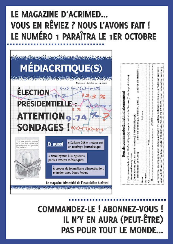En octobre 2011, l’association de critique des médias, Acrimed, lancera, sur 32 pages et avec quelques couleurs, son tout nouveau magazine trimestriel : Médiacritique(s).