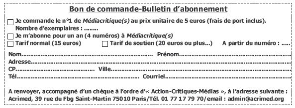 Pour recevoir le premier numéro dès sa parution, ou vous abonner, téléchargez, imprimez et retournez à Acrimed le fichier (.jpg) ci-dessous :